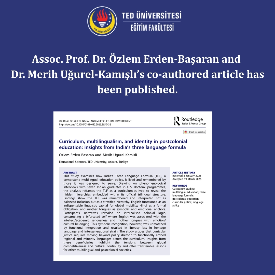 Assoc. Prof. Dr. Özlem Erden Başaran and Asst. Prof. Dr. Merih Uğurel-Kamışlı’s co-authored article has been published in the Journal of Multilingual and Multicultural Development (SSCI - Q1).